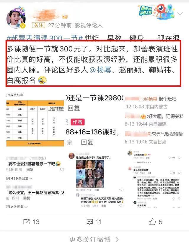 网友评价郝蕾的饰演课收费并不高,和艺考的收费性价比皆高,重要梗概学到真东西,不仅能提高演技,还能意识不少圈内东谈主。网友皆忽视王一博、赵丽颖、杨幂、鞠婧祎、白鹿等速即报名。网友亦然多事,当今流行演员在进组之前皆上饰演课,比如杨越过、杨幂等,但有些演技如故提高不大,可能没找对安分。
